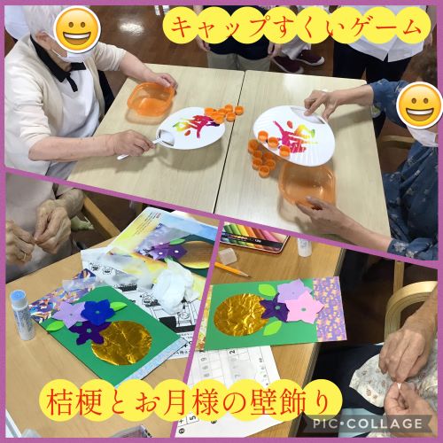・「桔梗の花とお月様」の壁飾りを製作しました。金色のお月様に4色の桔梗の花の色を組み合わせて貼り、素敵な作品を完成させていました。