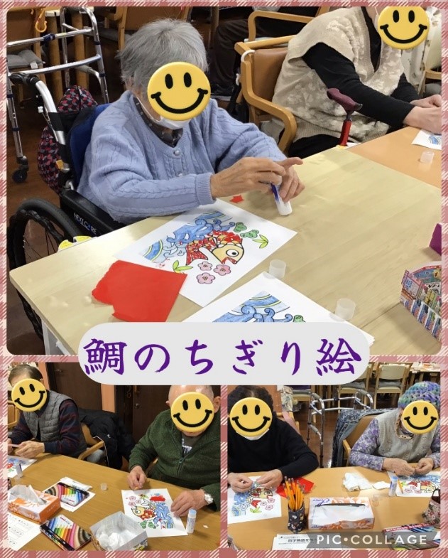 鯛のイラストの上に折り紙をちぎって、重ね付けをするちぎり絵を製作しました。