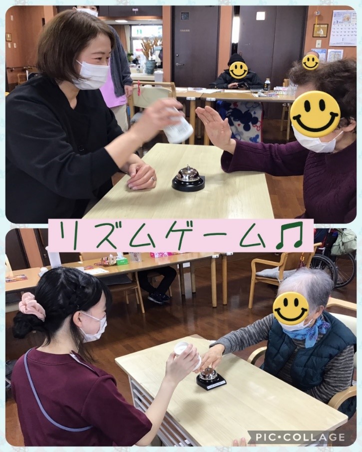 真ん中に呼び出しベルを置いて、上に紙コップをかぶせ、交互に歌に合わせながら紙コップに触れるゲームです。
