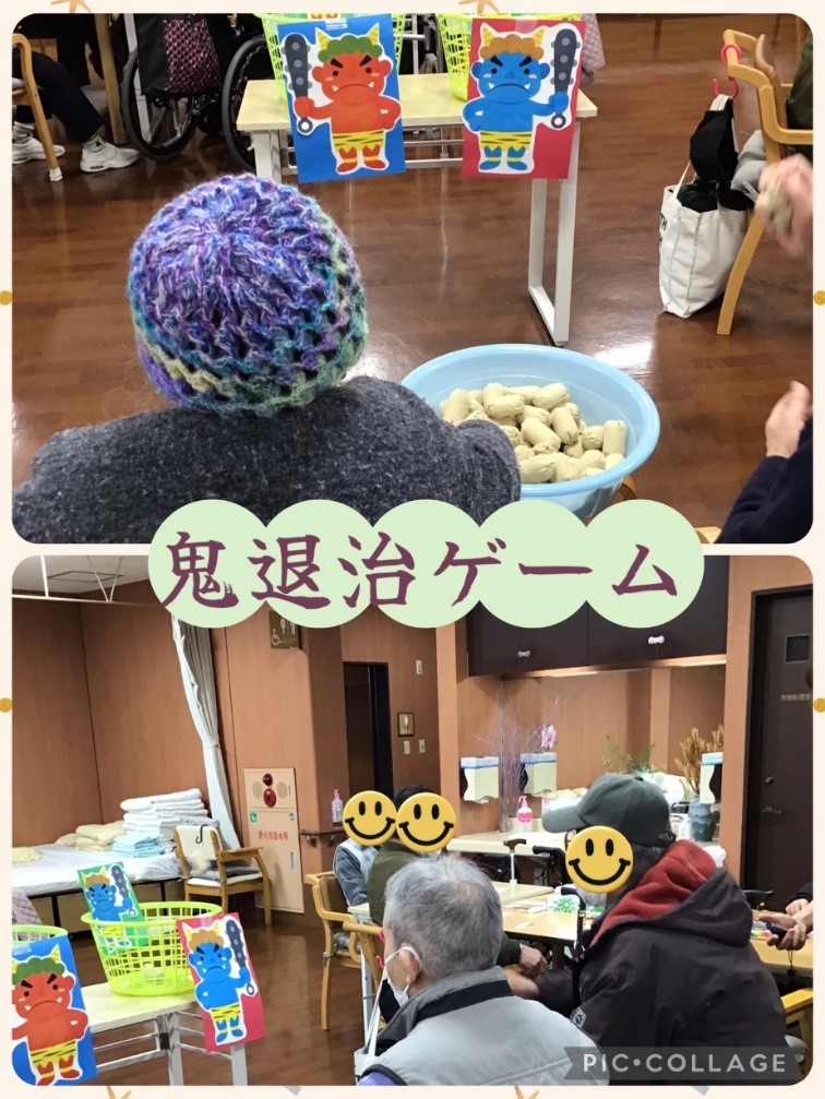 節分の「豆まき」を行いました。鬼のイラストをめがけ「鬼外!福は~内!」と掛け声をかけながら、豆に似せたお手玉をかごにいれ、個数を競うゲームです。